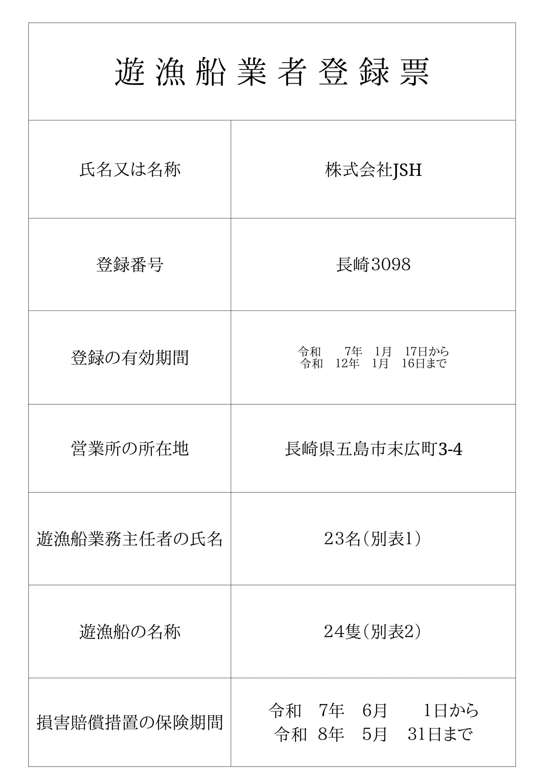 当協議会に所属する遊漁船業務主任者・使用する船舶は上記のとおりです。